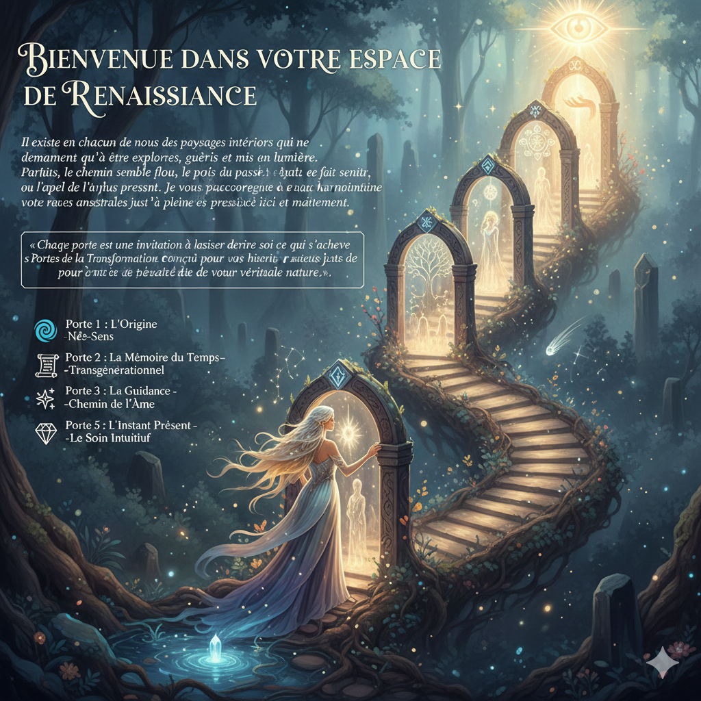 Je vous accompagne à franchir les 5 Portes de la Transformation : un parcours énergétique conçu pour harmoniser votre histoire, de vos racines ancestrales jusqu’à la pleine expression de votre présence ici et maintenant.
