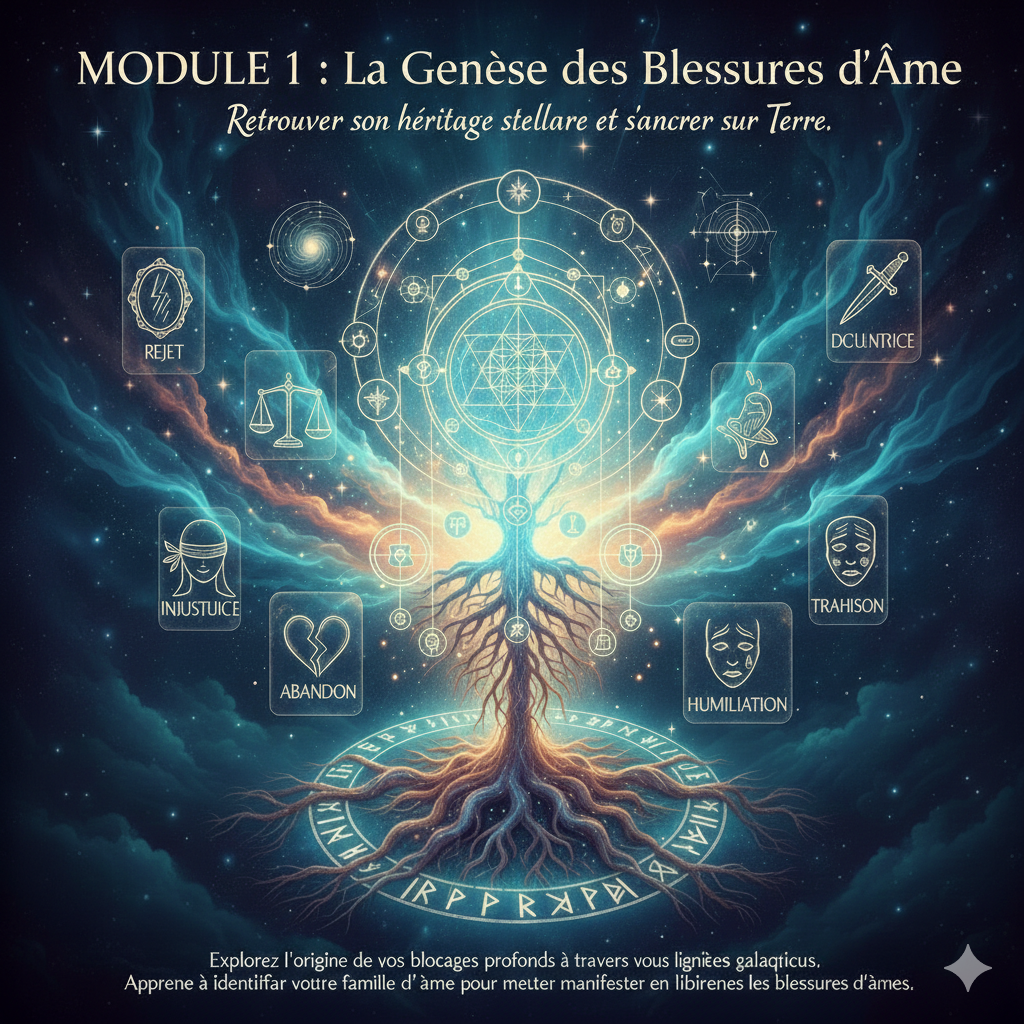 "Retrouver son héritage stellaire et s'ancrer sur Terre." Ce module explore l'origine de vos blocages profonds à travers vos lignées galactiques. Apprenez à identifier votre famille d’âme pour mieux manifester votre mission de vie.